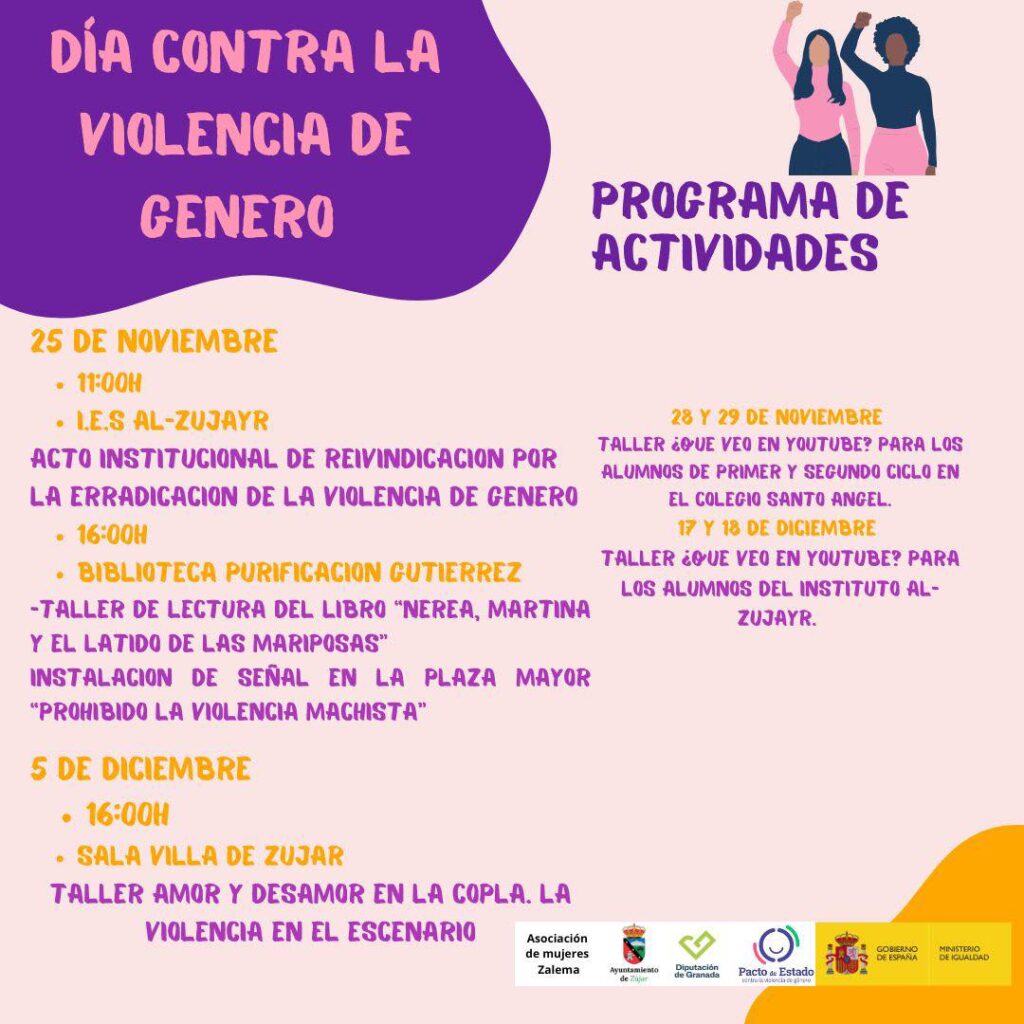 El Ayuntamiento de Zújar y la Asociación de Mujeres Zalema, en colaboración con el Pacto de Estado contra la Violencia de Género, presentan el programa de actividades para conmemorar el Día Internacional de la Eliminación de la Violencia contra la Mujer. Estas actividades tienen como objetivo sensibilizar, educar y reivindicar la erradicación de la violencia machista en nuestra sociedad.