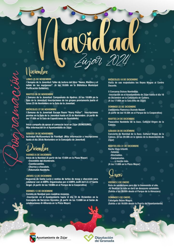 El Ayuntamiento de Zújar, en colaboración con la Diputación de Granada, presenta una amplia y variada programación para celebrar la Navidad 2024. Estas actividades están diseñadas para todas las edades y prometen llenar de magia, tradición y diversión las calles del municipio durante estas fechas tan especiales.